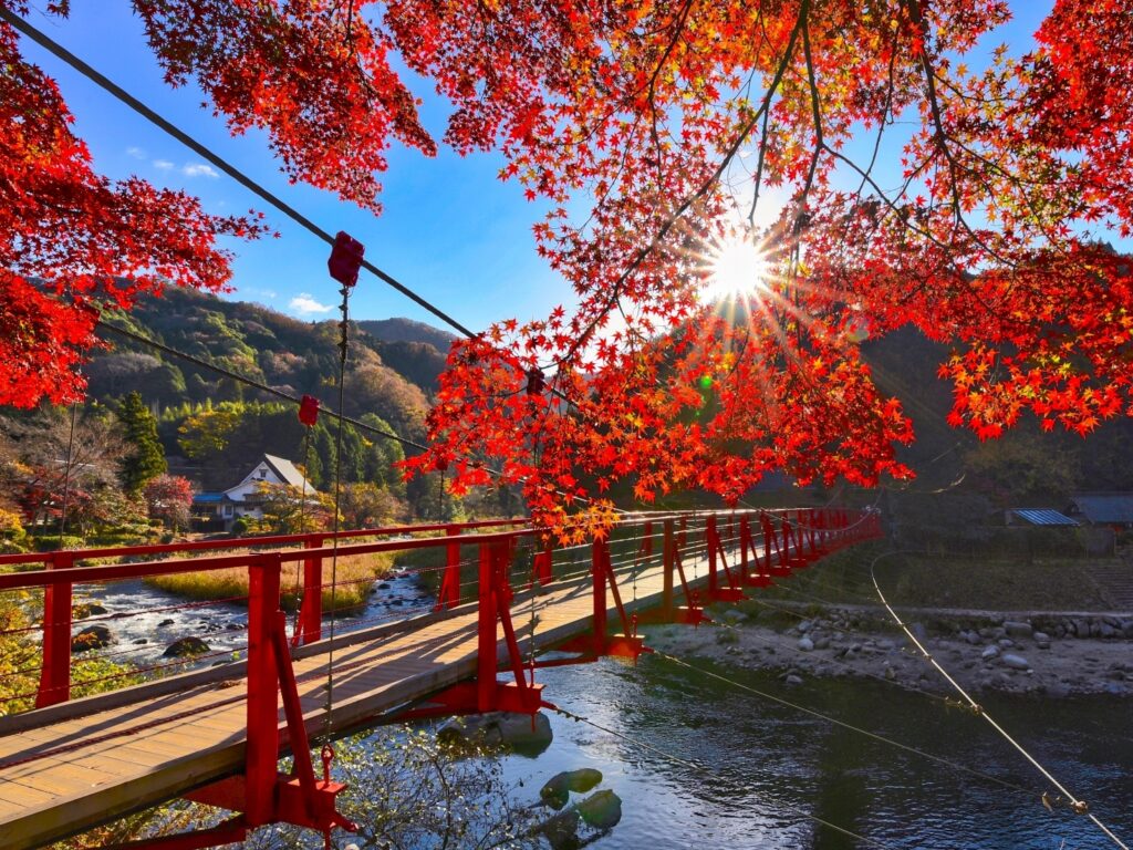 モミジの名所として知られる巴川沿いの渓谷。四季に色を変える里山の景観と、吊橋や中州の穏やかな流れがつくる光景が魅力です。新緑や紅葉期は歩道の起伏も穏やかで、家族やカップルの散策に向きます。川音を聞きながら橋と谷を周遊し、渓谷全体の立体感を楽しめます。