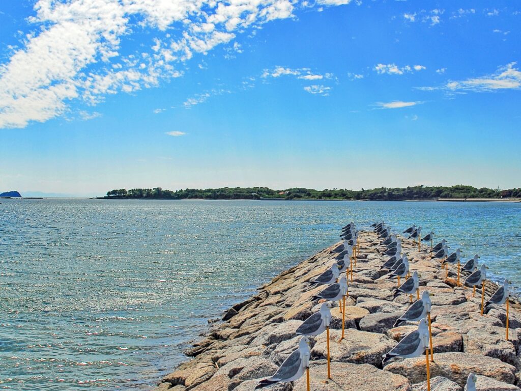 三河湾に浮かぶ里海の島。黒壁の集落と広がる海岸線、干潟や岩礁が連続する穏やかな海の表情が魅力です。歩いて回れるサイズ感で、岬や入り江ごとに異なる景観を楽しめます。季節の花や夕景も映え、のんびり過ごせます。