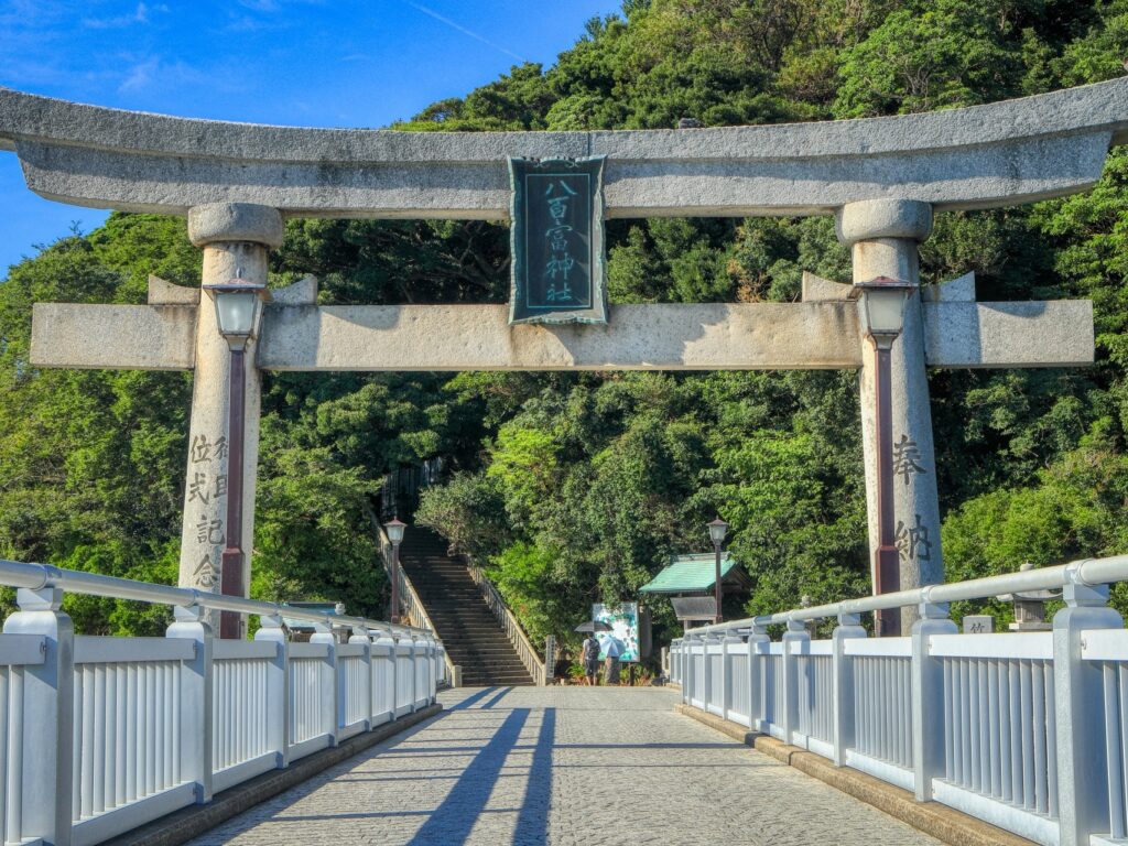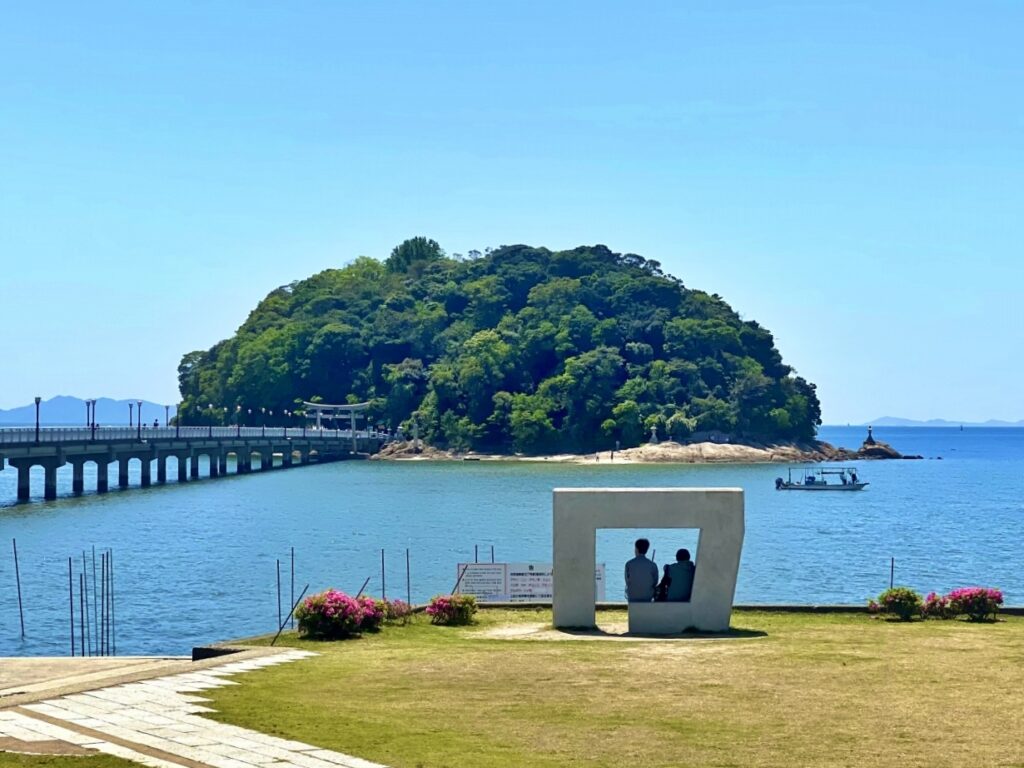 橋で陸地と結ばれた小島で、周囲約680mの遊歩道から三河湾の穏やかな海景を望めます。島は国の天然記念物に指定され、常緑樹林と岩礁の海岸線が織りなす固有の景観が魅力。夜明けの海と竹島橋のシルエットも人気です。