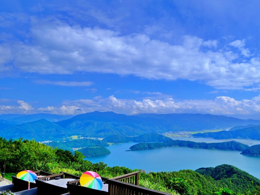 標高差で色が変わる五つの湖を一望する展望公園。テラスや足湯、ケーブル・リフトで楽に山頂へ。日本海と五湖のレイヤーが織りなすパノラマは四季で表情が変わります。