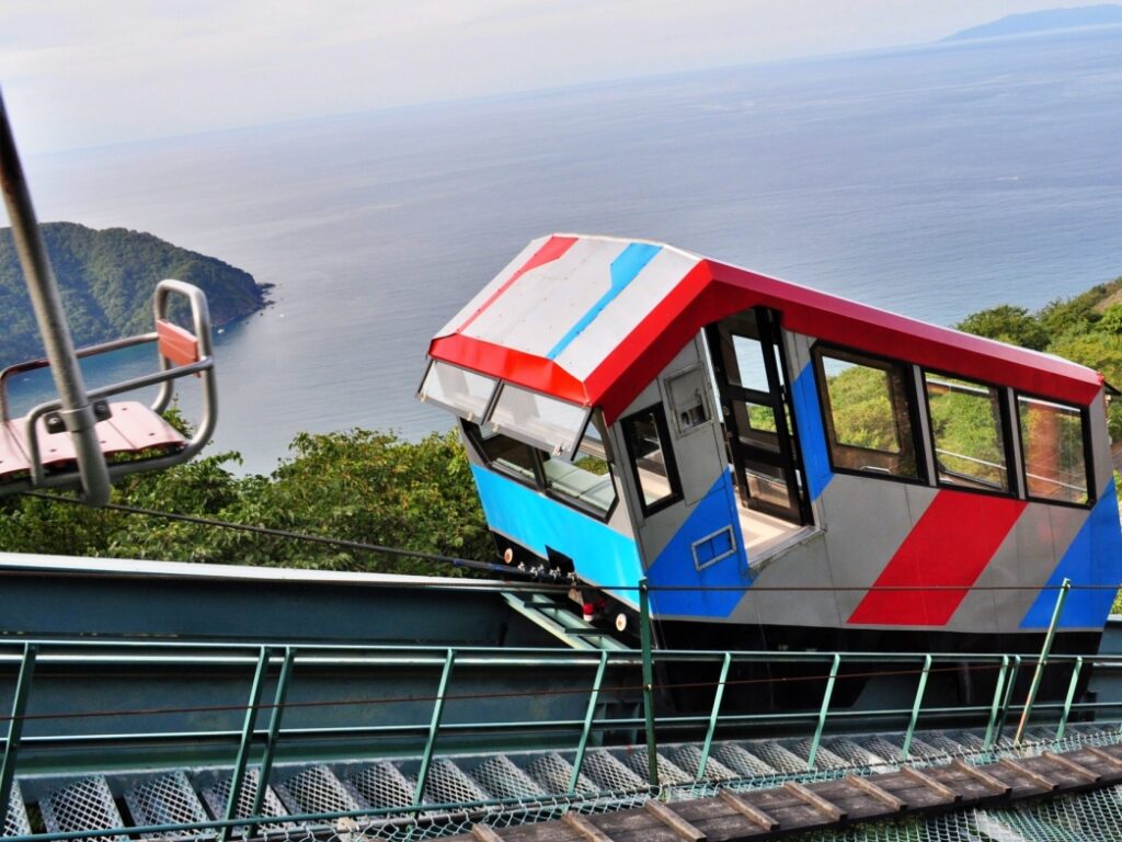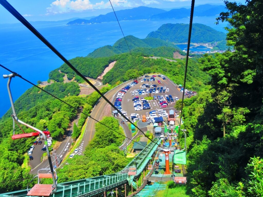 梅丈岳の山頂公園へ、ゲートからケーブルカーまたはリフトで上がる空中移動。テラスから三方五湖の色の違いと若狭湾を一望し、移動そのものが展望アクティビティになります。