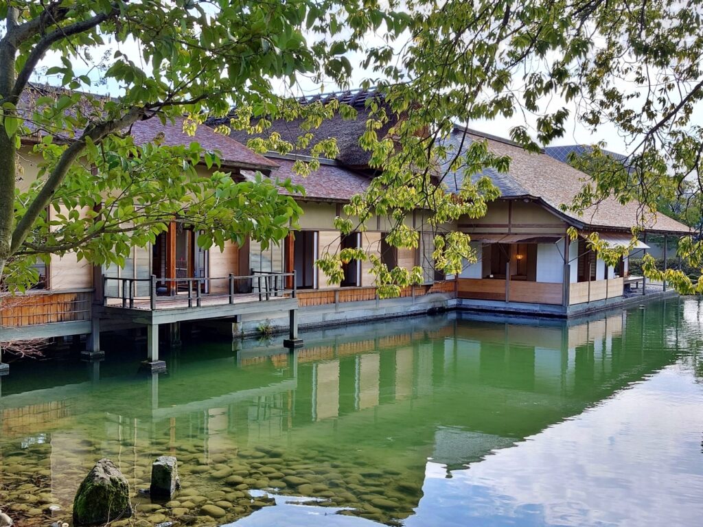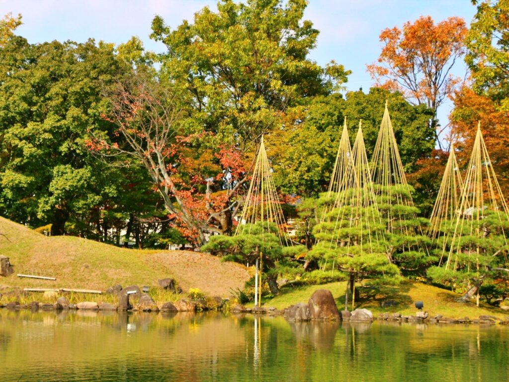 国名勝の池泉回遊式庭園。広い池に御亭が浮かぶように配され、水鏡に映る樹影が四季を彩ります。市街地の中心で静謐な借景が楽しめ、建物越しのフレーミングも絵になります。