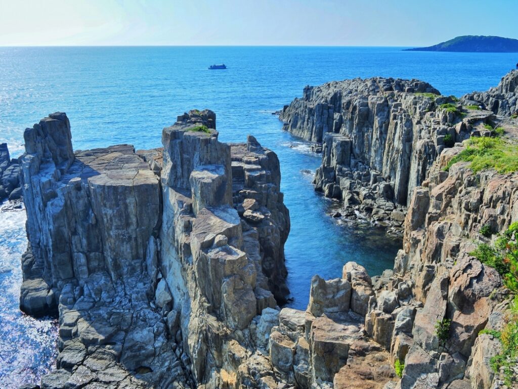 柱状節理の断崖が約1km続く福井の代表景観。海食で刻まれた垂直岩壁と荒波のコントラストが迫力です。遊歩道から岩肌越しに日本海を望み、夕刻は崖の縁が茜色に染まるドラマチックな時間を楽しめます。