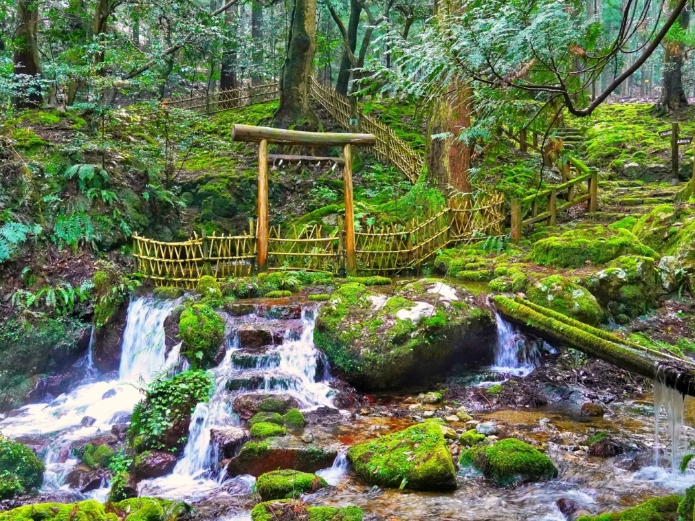 夏~初秋の朝が光と水煙のコントラストが美しく、人の少ない時間に清流音を堪能できます。JR「上中」から徒歩+路線バスの乗継も選択肢。