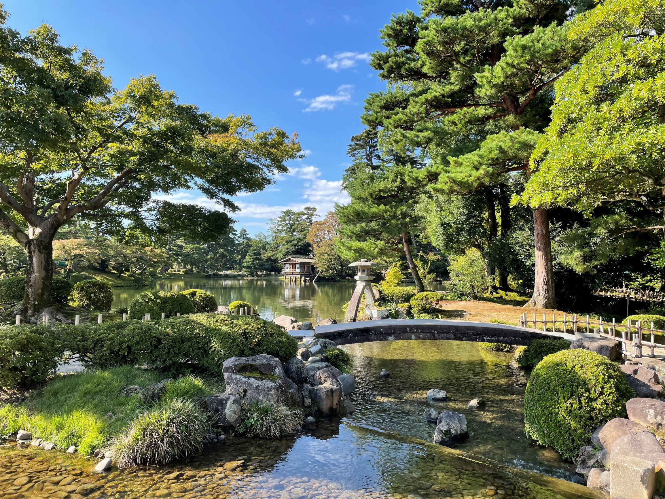 加賀藩庭師の技が息づく林泉回遊式庭園。霞ヶ池や唐崎松、ことじ灯籠など名所が点在し、四季の移ろいを端正に切り取ります。園路は緩やかで歩きやすく、歴史ある眺めを静かに楽しめます。