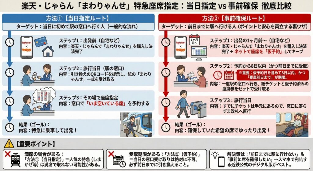 窓口で対面相談しながら購入し、その場で座席指定も行います。 - メリット: