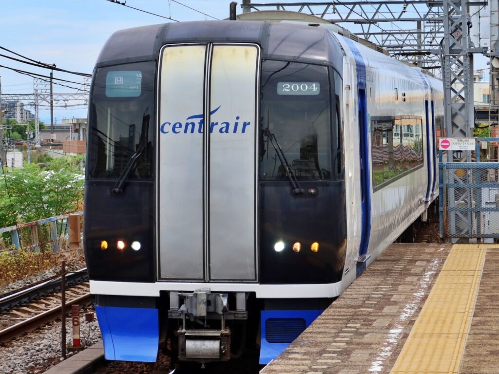 「ミュースカイ」という青い電車以外なら、どれに乗っても神宮前へ行けます。
